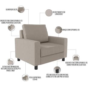 As possibilidades para sua disposição são infinitas, seja para escritório, recepção, sala de espera ou estar, entre outras, seu conforto e beleza transformarão sua decoração por inteiro. Cabe mencionar também seu revestimento em Linho Bege, que contrasta perfeitamente com os pés na cor preto fosco e dão uma sutil delicadeza à peça. Garanta já a sua!
