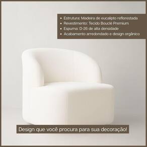 Estrutura: Madeira de eucalipto reflorestada e madeira maciça. Revestimento: Tecido Bouclé Premium. Enchimento: Espuma D-24.A Poltrona Orgânica Aloh Bouclé Premium é a escolha perfeita para quem busca estilo, conforto e sofisticação em um só produto. Seu revestimento em tecido bouclé, de textura macia e elegante, aliado às linhas contemporâneas, transforma o ambiente em um espaço mais acolhedor e moderno.