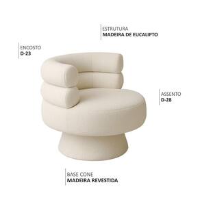 Poltrona Orgânica Mabel Base Giratória Bouclé Off White - Nexta Casa Poltrona Mabel Charme Contemporâneo e Conforto Acolhedor Transforme seu espaço com uma peça que une sofisticação e serenidade em cada curva!Descrição do Produto A Poltrona Mabel, da Nexta Casa, é a definição de elegância e versatilidade. Com linhas curvas suaves e design contemporâneo, ela se adapta a diversos estilos de decoração, do minimalista ao mais ousado, trazendo charme a salas de estar, quartos ou escritórios. Revestida em tecido Bouclé, oferece uma textura macia e um visual sofisticado, perfeito para criar um ambiente acolhedor. A estrutura em madeira reflorestada de eucalipto garante durabilidade, enquanto a espuma D-28 HR no assento, sobre chapas de OSB, e D-23 no encosto, sobre percintas elásticas de nylon, proporcionam conforto ergonômico para momentos de relaxamento. Sua base em forma de cone em madeira revestida suporta até 100 kg, unindo estabilidade e estética natural. Compacta e pronta para uso imediato, a Poltrona Mabel é a peça ideal para embelezar seu cantinho favorito! Características Técnicas Estrutura: Madeira reflorestada de eucalipto tratada, com partes em MDF e OSB robustez e sustentabilidade. Assento: Espuma D-28 HR sobre chapas de OSB conforto firme e duradouro. Encosto: Espuma D-23 sobre percintas elásticas de nylon suporte ergonômico ideal. Revestimento: Bouclé visual sofisticado e toque macio. Base/Pés: Madeira revestida, giratória. Peso Suportado: Até 100 kg sem impacto. Medidas Altura Total: 80 cm Largura: 84 cm Profundidade: 75 cm Peso: 23 kg Altura do Encosto: 32 cm Altura do Assento ao Chão: 48 cm Largura do Assento: 50 cm Profundidade do Assento: 57 cm Altura do Braço ao Assento: 32 cm Largura do Braço: 18 cm Altura dos Pés: 25 cm Diferenciais Design moderno linhas curvas suaves para um visual contemporâneo e versátil. Compacta e versátil ideal para diversos ambientes, de salas a escritórios. Espuma D-28 HR no assento conforto de alta qualidade. estabilidade e charme natural Quantidade de Volumes: 1. Não necessita de montagem pronta para uso imediato! Cuidados Utilizar um pano levemente umedecido com água, seguido de pano seco. Evitar exposição ao sol para preservar a cor vibrante do tecido. Não sentar nos braços ou encosto do produto. Não usar produtos abrasivos ou escovas. Garantia 3 meses contra de fabricação. Observações Imagens ilustrativas; tonalidade pode variar devido à configuração de cores da tela. Objetos de decoração não inclusos. Produtos enviados embalados com , reduzindo riscos de danos. Verificar as condições da embalagem na e reportar danos no . até a porta de entrada ou portaria. Confirme as dimensões e compatibilidade do de instalação. Não nos responsabilizamos por montagem, desmontagem, instalação ou por escadas/elevadores. Marca: Não Informado