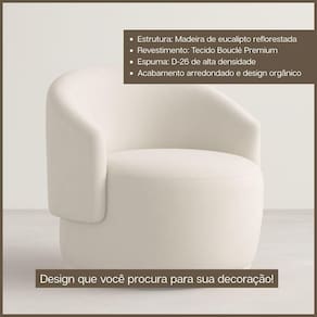 Madeira de eucalipto reflorestada, Tecido Bouclé Premium, Espuma D-24A Poltrona Orgânica Oasis Bouclé Premium combina design contemporâneo, conforto e sofisticação em uma peça única. Seu revestimento em tecido bouclé, de textura macia e sofisticada, transforma o ambiente em um espaço acolhedor e moderno.