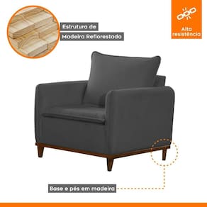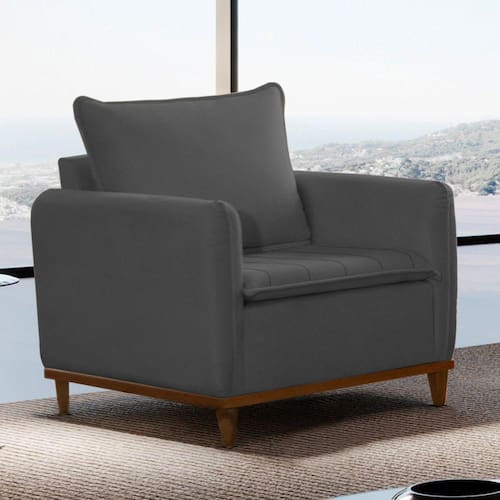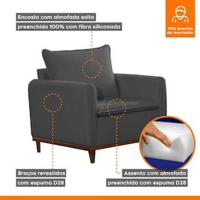 Apresentamos nossa poltrona de luxo, projetada para proporcionar conforto incomparável e estilo elegante. Com estofamento de alta qualidadel, oferece o máximo em relaxamento. Seu design contemporâneo e durabilidade excepcional fazem o complemento perfeito para qualquer espaço. Transforme sua casa ou escritório em um oásis de conforto e sofisticação com nossa poltrona. Acompanha Almofadas extras: Não Acompanha Puff: Não Almofada do assento: Fixa Almofada do encosto: Removível Altura do assento até o chão: 45 Altura do Encosto: 50 Altura dos Pés: 13 Ambiente Principal: Sala de Estar Complexidade da Montagem: Baixa: pode ser montado por uma pessoa sozinha Cor: Jolie/Grafite Cor do Produto: Jolie/Grafite Design Assinado: Não Enchimento do Assento: Espuma D-28 Enchimento do Braço: Espuma D-28 Enchimento do Encosto: Fibra Siliconada Encosto para a Cabeça: Não Estampado: Não Extensível: Não Firmeza do Assento: Macio Informações Complementares: Molas Espiral Itens Inclusos: 1 Poltrona, kit de ferragens, orientação de montagem Linha ou Coleção: Armany Manual de Montagem e Instalação: https://product-hub-prd.madeiramadeira.com.br/903986/documents/a414d6b7-5006-4034-8a88-6a4b5eb0f4ad19020088.pdf Material do Braço: 10cm revestidos com Espuma D-28 e manta acrílica Material dos Pés: Madeira Modelo de Poltrona: Fixo Necessita Montagem: Sim Origem do Produto: Nacional Peso: 20 Possui Percintas Elásticas: Sim Possui Pés: 04 Possui Rodízio: Não Recomendações de Uso, Manutenção e Limpeza: A limpeza do revestimento deve ser feita com escova ou tecido de algodão branco levemente umedecidos em água morna, sabão neutro ou produto específico. Não usar produtos corrosivos nem a base de solventes, como: cloro, alvejantes, detergentes, entre outros;Não expor o estofado à luz direta. Mantenha portas e janelas sempre protegidas com cortinas e blackout. A exposição contínua à radiação da luz, danifica o revestimento, apodrecendo os fios, trincando a superfície e desbotando as cores;Não lavar o revestimento das almofadas pois pode desfiá-las, abrindo as costuras;Não utilizar o estofado para fins diferentes do que foi projetado: ficar em pé, pular, arrastar, sentar nos braços, peso na caixa traseira, entre outros tipos de ações que poderão danificar o produto. Resistente à Chuva: Não Sistema de Montagem: Parafusos Suporta Até (kg): 120 Tecido Predominante: Veludo Tipo de Assento: Fixo Tipo de Encosto: Fixo Tipo de Espuma do Assento: Soft Tipo de Espuma do Encosto: Fibra Siliconada Tipo de Poltrona: Decorativa
