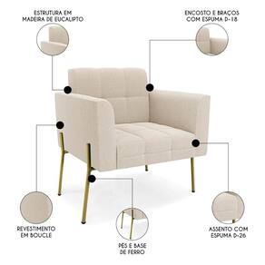 Se você quer uma poltrona que combine com a sua Sala De Estar, recepção ou seu quarto, que ofereça conforto e qualidade? Então você vai adorar a Poltrona Para Sala Pés Metálicos Dourado Ana Bouclé Bege, da Ibiza!