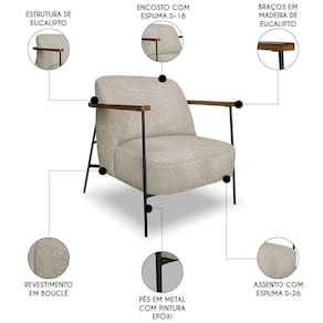 A Poltrona para Sala Pés Metálicos Ellen S06 Boucle Bege, da Mpozenato é uma peça que exemplifica a alta decoração com seu design único, capaz de se adaptar a uma variedade de ambientes, desde os mais clássicos até os de Estilo Industrial.A base em aço carbono, complementada por uma pintura epóxi automotiva de alto padrão, não apenas garante durabilidade, mas também adiciona um toque de sofisticação. O assento é feito com espuma HR28, conhecida por sua alta resiliência e conforto, enquanto o encosto utiliza espuma D23 Soft, proporcionando um suporte suave e agradável. O uso de madeira maciça de eucalipto nos braços da poltrona traz a beleza natural da madeira para o design. Já o revestimento em Boucle, com sua textura característica, oferece um acabamento elegante e contemporâneo, tornando a Poltrona Decorativa uma escolha distinta para quem busca conforto e estilo em uma única peça. Adicione em seu carrinho de compras e inove a sua Sala de Estar! ESPECIFICAÇÕES Dimensões do Produto Largura: 86 cm. Altura: 87 cm. Profundidade: 86 cm. Peso: 21,5 Kg. Outras MedidasAltura do encosto: 45 cm. Largura do assento: 70 cm. Profundidade do assento: 52 cm. Altura do chão ao assento: 45 cm. Altura da Braça: 70 cm. Características do ProdutoMaterial da Estrutura: Madeira de Eucalipto. Material da Espuma: Assento D-26/ Encosto D-18. Peso Suportado: 120 Kg. Revestimento: Boucle. Tipo de Encosto: Fixo. Tipo de Assento: Fixo. Quantidade de Lugares: 1 Lugar. Possui Pés: Sim. Material dos Pés: Metal. Diferenciais:- Design moderno.- Base em metal.- Base com pintura epóxi.- Braços em madeira de eucalipto.Sistema de Montagem: O produto é enviado montado, sendo necessário somente parafusar a base. Manual de Montagem: Não. Conteúdo da Embalagem: 1 Poltrona. Volumes: 1 Volume. do Fabricante: 90 dias contra defeito de fabricação. Montagem: Recomendamos que seja feita por um . Recomendação de Limpeza: Utilize pano levemente úmido. Observações importantes- Produto para uso residencial em ambiente interno, não devendo ficar exposto diretamente ao sol, calor e umidades excessivas.- Pode haver alguma diferença de tonalidade entre a imagem e o produto real, por conta do tratamento de imagens e a calibração de cores do seu monitor.- As imagens são meramente ilustrativas, não acompanham objetos de decoração e eletrônicos.- Ao receber a mercadoria, o cliente deve verificar as condições da embalagem, caso haja alguma não assine o comprovante de recebimento.- Montagem, desmontagem e outras instalações serão de responsabilidade do cliente. Não nos responsabilizamos, no ato da , por subir escadas/elevadores ou pelo transporte por guincho em apartamentos. Eventuais despesas são de responsabilidade do comprador.- Confira as dimensões do produto e certifique-se de que passará normalmente por supostos elevadores, portas, escadas e/ou corredores de sua residência.- Montagem, desmontagem e outras instalações serão de responsabilidade do cliente. Não nos responsabilizamos, no ato da , por subir escadas/elevadores ou pelo transporte por guincho em apartamentos. Eventuais despesas são de responsabilidade do comprador.