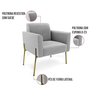 Todo mundo gosta de um ambiente bem decorado, e se for novidade melhor ainda não é mesmo? A D'Rossi, além de entregar beleza, qualidade e confiança aos clientes, ela dispõe das melhores opções em produtos, disponíveis no mercado! Portanto, se você quer um produto sofisticado, opte pela Poltrona Marisa. Ela possui um design lindo e sofisticado, com pés de Ferro Lateral Dourado e revestimento em tecido Suede, que harmonizam com qualquer ambiente. Esta mobília fica perfeita na sala de estar, recepções, mesa de jantar ou qualquer outro espaço que você queira decorar com estilo e bom gosto. Ela contém uma estrutura em madeira de reflorestamento eucalipto, que garante a resistência e a sustentabilidade do produto. Ela suporta até 120 kg de peso, podendo ser utilizada por pessoas de diferentes biotipos. Ela tem um acabamento reforçado e espuma de qualidade D-23, garantindo flexibilidade e conforto ao usuário. A Poltrona Marisa é um produto de alta qualidade, beleza e funcionalidade. Ela é fácil de transportar, pois tem um peso leve e um tamanho compacto. A Poltrona Marisa é ideal, para dar aquele realce que seu ambiente precisa. Tenho certeza que esse móvel é a melhor compra que você irá fazer. Garanta já sua Poltrona Marisa e se acomode da melhor maneira possível!Dimensões da Poltrona: Altura total: 81 cm Largura total: 76 cm Profundidade total: 64 cm Altura do encosto: 36 cm Largura do assento: 47 cm Profundidade do assento: 48 cm Altura do chão ao assento: 45 cm Espessura do assento: 18 cm Tamanho dos pés: 30 cm Espessura do braço: 9 cm Peso: 14 kg Especificações do Produto Estrutura: Madeira Eucalipto Espuma: D-23 Tecido: Suede Tipo de pés: Pés de Ferro Dourado Peso suportado: Até 120 Kg Garantia: 90 dias contra defeito de fabricação Montagem: O produto vai montado, apenas parafusar a base Instruções de limpeza: Utilizar um pano limpo e levemente úmido Você irá receber: Poltronas - Entregue em: 01 Volumes