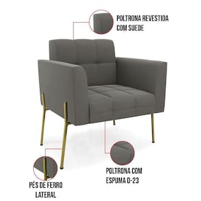 Você gosta de colecionar vários momentos memoráveis com sua família e amigos? Que tal recebê-los, com móveis de altíssima qualidade que só a D'Rossi tem? A Poltrona Elisa é adequada para você! Seu design retrô é a grande tendência do momento. Pode ser usada em diversos espaços da casa, em salas, hall de entrada, quartos, cozinhas, varanda, sacada, escritório, dentre outros. Contém as seguintes características: A estrutura é feita Madeira de Eucalipto 100% de reflorestamento, Pés de Ferro Dourado que além de ser resistente e durável, suporta em média até 120 kg. Assento, encosto e braços, contém enchimento de espuma D-23 e é estofada em tecido Suede, que oferece muito conforto e resistência ao sentar, com aquela sensação de maciez e aconchego. Possui também, detalhes de costura no encosto e assento, resultando em um acabamento impecável, conferindo muito mais valor e elegância ao seu espaço. Para complementar a decoração com essa linda poltrona, a dica é utilizar mantas, almofadas ou vasinho de flor. E pronto, seu cantinho estará perfeito para descansar e relaxar! Aqui, você encontra várias opções, para que seus amigos e familiares se sintam acolhidos. Garanta já sua Poltrona.