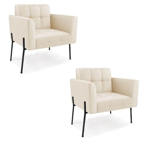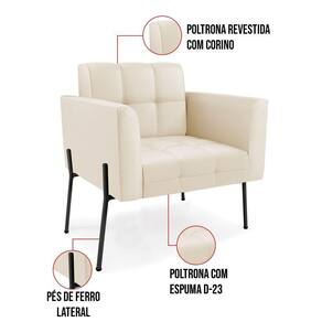 Você gosta de colecionar vários momentos memoráveis com sua família e amigos? Que tal recebê-los, com móveis de altíssima qualidade que só a D'Rossi tem? A Poltrona Elisa é adequada para você! Seu design retrô é a grande tendência do momento. Pode ser usada em diversos espaços da casa, em salas, hall de entrada, quartos, cozinhas, varanda, sacada, escritório, dentre outros. Contém as seguintes características: A estrutura é feita Madeira de Eucalipto 100% de reflorestamento, Pés de Ferro Preto que além de ser resistente e durável, suporta em média até 120 kg. Assento, encosto e braços, contém enchimento de espuma D-23 e é estofada em tecido Corino, no tom Bege, que oferece muito conforto e resistência ao sentar, com aquela sensação de maciez e aconchego. Possui também, detalhes de costura no encosto e assento, resultando em um acabamento impecável, conferindo muito mais valor e elegância ao seu espaço. Para complementar a decoração com essa linda poltrona, a dica é utilizar mantas, almofadas ou vasinho de flor. E pronto, seu cantinho estará perfeito para descansar e relaxar! Aqui, você encontra várias opções, para que seus amigos e familiares se sintam acolhidos. Garanta já seu Kit 2 Poltronas..