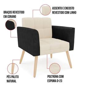 Você gosta de colecionar vários momentos memoráveis com sua família e amigos? Que tal recebê-los, com móveis de altíssima qualidade que só a D'Rossi tem? A Poltrona Elisa é adequada para você! Seu design retrô é a grande tendência do momento. Pode ser usada em diversos espaços da casa, em salas, hall de entrada, quartos, cozinhas, varanda, sacada, escritório, dentre outros. Contém as seguintes características: A estrutura é feita de madeira de Eucalipto 100% de reflorestamento, e a Pés Palito Natural, além de ser resistente e durável, suporta em média até 120 kg. Assento, encosto e braços, contém enchimento de espuma D-23 e é estofada em tecido Corano Preto com Linho, no tom Bege, que oferece muito conforto e resistência ao sentar, com aquela sensação de maciez e aconchego. Possui também, detalhes de costura no encosto e assento, resultando em um acabamento impecável, conferindo muito mais valor e elegância ao seu espaço. Para complementar a decoração com essa linda poltrona, a dica é utilizar mantas, almofadas ou vasinho de flor. E pronto, seu cantinho estará perfeito para descansar e relaxar! Aqui, você encontra várias opções, para que seus amigos e familiares se sintam acolhidos. Garanta já sua Poltrona.