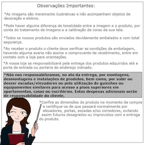 Dimensões do Produto:Largura: 160cmAltura: 110cmProfundidade: 98cmProfundidade Aberto: 148cmAltura do Assento: 45cmAltura do Encosto: 70cmProfundidade do Assento: 50cmLargura do Assento: 52cmLargura dos Braços: Canto 15cm, meio 21cm Características do Produto:Material da Estrutura: Madeira de Reflorestamento de EucaliptoEncosto: Fibra Siliconada e Percinta Elástica Assento: Espuma D-26 Soft e Percinta ElásticaBraço: Enchimento em Espuma D-20Sistemas: Reclinável com Mecanismo Independente de 02 Estágios e 03 Posições. Posição 01 (Sentado), Posição 02 (Leitura) e Posição 03 (Descanso)Sistema de Abertura: Com as Mãos nas Braças, Flexionar o Corpo para Trás e Mãos para Frente.Detalhes: Porta Copo Embutido nos Braços Centrais e Revisteiro Lateral nas BraçasMaterial dos Pés: Madeira Revestidos em Alumínio CromadosRevestimento: PUQuantidade de Pés: 6Tipo de Pés: FixoPeso Suportado: 110 Kg por Assento;Conteúdo da Embalagem: 1 Poltrona 2 LugaresNecessita de Montagem: NãoInstruções/Cuidado: Utilizar um pano levemente umedecido com água, seguido de pano seco. Evitar exposição ao sol, para que o produto não sofra alterações na cor. Não limpar com escovas ou produtos abrasivos.