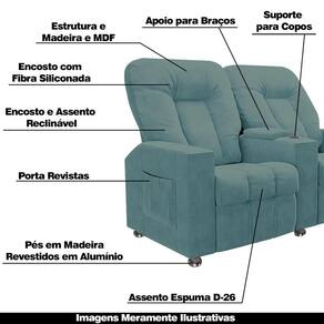 Dimensões do Produto:Largura: 160cmAltura: 110cmProfundidade: 98cmProfundidade Aberto: 148cmAltura do Assento: 45cmAltura do Encosto: 70cmProfundidade do Assento: 50cmLargura do Assento: 52cmLargura dos Braços: Canto 15cm, meio 21cm Características do Produto:Material da Estrutura: Madeira de Reflorestamento de EucaliptoEncosto: Fibra Siliconada e Percinta Elástica Assento: Espuma D-26 Soft e Percinta ElásticaBraço: Enchimento em Espuma D-20Sistemas: Reclinável com Mecanismo Independente de 02 Estágios e 03 Posições. Posição 01 (Sentado), Posição 02 (Leitura) e Posição 03 (Descanso)Sistema de Abertura: Com as Mãos nas Braças, Flexionar o Corpo para Trás e Mãos para Frente.Detalhes: Porta Copo Embutido nos Braços Centrais e Revisteiro Lateral nas BraçasMaterial dos Pés: Madeira Revestidos em Alumínio CromadosRevestimento: VeludoQuantidade de Pés: 6Tipo de Pés: FixoPeso Suportado: 110 Kg por Assento;Conteúdo da Embalagem: 1 Poltrona 2 LugaresNecessita de Montagem: NãoInstruções/Cuidado: Utilizar um pano levemente umedecido com água, seguido de pano seco. Evitar exposição ao sol, para que o produto não sofra alterações na cor. Não limpar com escovas ou produtos abrasivos.