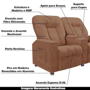 Desenvolvida para superar as suas expectativas, a Poltrona Reclinável 2 Lugares, veio para trazer a experiência cinematográfica sem você sair do conforto de seu lar. Esta poltrona é uma excelente escolha para qualquer ambiente, seja ele sua sala de estar, quarto ou até mesmo sala de cinema, além disso, a poltrona é feita com materiais de alta qualidade, garantindo durabilidade e resistência para longas horas de uso. Uma peça única, confortável e pronta para você. Não perca tempo, adquira já a sua. Dimensões do Produto (L x A x P) 160 cm x 110 cm x 98 cm Profundidade Aberto: 148 cm Altura do Encosto: 70 cm Altura do Assento: 45 cm Largura do Assento: 52 cm Profundidade do assento: 50 cm Características: Estrutura em madeira de reflorestamento de eucalipto e MDF. Encosto reclinável com fibra siliconada. Assento reclinável com espuma D-26. Braça com espuma D-20. Possui mecanismo de 02 estágios e 03 posições. Contém porta copo nas braças e revisteiro na lateral. Pés em madeira revestidos em alumínio. Revestimento em Veludo na cor Terracota. Suporta 110 Kg por assento. - A tonalidade do produto real poderá ter ligeira variação devido o lote de tecidos. - A limpeza deve ser feita com pano levemente umedecido em água limpa, sem esfregar, não utilizar produtos abrasivos, desengordurantes, álcool ou solvente.. Observações importantes: - Produto para uso em ambiente interno, não devendo ficar exposto diretamente ao sol, calor e umidade excessivos. - Pode haver alguma diferença de tonalidade entre a imagem e o produto real, por conta do tratamento de imagens e a calibração de cores do seu monitor. - As imagens são meramente ilustrativas, não acompanham objetos de decoração e eletrônicos. - Ao receber a mercadoria, o cliente deve verificar as condições da embalagem, caso haja alguma não assine o de . - Montagem, desmontagem e outras instalações serão de responsabilidade do cliente. Não nos responsabilizamos, no ato da , por subir escadas/elevadores ou pelo por guincho em apartamentos. Eventuais despesas são de responsabilidade do comprador. - Confira as dimensões do produto e certifique-se de que passará normalmente por supostos elevadores, portas, escadas e/ou corredores de sua residência. ColorFamily: Laranja | ColorSimple: Laranja | Material: Madeira de Eucalipto, Fibra siliconada, Percintas Elásticas. Espuma D-20 e D-26, Aluminio | MaterialFamily: Madeira, Espuma, MDF | OriginState: PR | Formato do sofá: Ergonômico | Largura: 160 cm | ProductWeight: 76 kg | Profundidade: 98 cm | ProductHeight: 110 cm | Estilo: Moderno | Fabricante: Lyam Decor | ProductContents: 01 Poltrona | ProductWidth: 160 cm | Peso: 76 kg | OriginCountry: | ColorSupplier: Terracota | Material do estofamento: Veludo | Desenho do tecido: Liso | Color: Laranja | Altura: 110 cm | Tipo de produto: Poltrona | Material de enchimento do encosto: Fibra Siliconada | Cor: Terracota | Peso máximo suportado: 110 kg | Linha: Sala de Cinema | Model: Romeo | ProductLength: 98 cm | ProductWarranty: 90 dias após o do produto | Unidades por kit: 1 | ProductInstructions: Produto para uso em ambiente interno, nao devendo ficar exposto ao sol, calor e umidade excessivos. | SizeDescription: Altura: 110 cm x Largura: 160 cm x Profundidade: 98 cm | Requer montagem: Não | SupplierSimpleName: Poltrona Reclinável 2 Lugares Sala de Cinema Romeo F05 Veludo Terracota - Lyam Decor | Mecanismo de abertura do produto: Reclinável | Densidade da espuma do assento: Espuma D-26