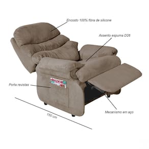 Poltrona Reclinável com espumas de alto conforto no assento e encosto enchido com 100% de fibra de silicone para proporcionar um ótimo conforto, tecidos com toques aveludados, porta revista na lateral, mecanismo em aço, estrutura em madeiras tratadas de reflorestamento, uma poltrona que pode ser usada tanto na sala como quarto. Produto Montado: Sim Acompanha Almofadas extras: Não Acompanha Puff: Não Almofada do assento: Fixa Almofada do encosto: Fixa Altura do assento até o chão: 50.0000 Altura do Encosto: 100 cm Altura dos Pés: 5 cm Ambiente Principal: Sala de Estar codigo_ean: 7898945292504 Cor: Chocolate Cor: Chocolate Design Assinado: Não Estampado: Não Extensível: Não Itens Inclusos: 1 Poltrona, 4 Pés e Parafusos. Material dos Pés: Plástico Modelo de Poltrona: Reclinável Necessita Montagem: Sim Peso: 33,8 kg Possui Percintas Elásticas: Sim Possui Pés: 04 Possui Rodízio: Não Recomendações de Uso, Manutenção e Limpeza: Não limpar com álcool ou qualquer outro produto químico.Utilize somente pano seco ou levemente umedecido. Sistema de Montagem: Encaixe e Parafusos Suporta Até (kg): 110 kg Tecido Predominante: Suede Tipo de Assento: Fixo Tipo de Encosto: Regulável Tipo de Poltrona: Do Papai Ean: 7898945292504