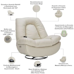 Seu design orgânico, com linhas curvas e elegantes, transforma qualquer ambiente em um refúgio de relaxamento. Com 6 pontos de massagem e aquecimento no encosto, essa poltrona de massagem alivia tensões musculares enquanto você desfruta de momentos revigorantes. A função reclinável elétrica, base giratória manual e o prático conector USB embutido na lateral garantem conveniência total. Para completar, o controle remoto permite ajustes de acordo com o gosto pessoal, o que torna a experiência ainda mais personalizada.