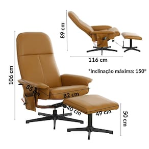 Peso e medidas (aproximados) Medidas da cadeira sentada: 106 x 82 x 85 cm (altura x largura x profundidade) Medidas da cadeira reclinada: 89 x 82 x 116 cm (altura x largura x profundidade) Medidas do apoio de pés: 50 x 49 x 40 cm (altura x largura x profundidade) Medidas da embalagem: 44 x 72 x 84 cm (altura x largura x comprimento) Peso bruto: 25 kg