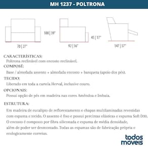 Poltrona Reclinável Mh-1237 Herval Estofada Marrom B Já imaginou que delícia vão ser os seus momentos de descanso ou leitura com o conforto da poltrona MH-1237? Ela é reclinável, estofada e revestida em tecido ou couro macio para garantir uma sensação mais suave quando em contato com a pele e de quebra, tem um estilo único, com formato perfeito para abraçar e o seu corpo durante o uso e com a ajuda estrutura em madeira de eucalipto entrega mais resistência e qualidade, dando mais segurança na hora de usa-la. É um cantinho confortável na sua sala de estar ou quarto que você quer? Com esse móvel você pode ter! Há outras possibilidades de acabamento para o revestimento. Cor: Marrom | Garantia (via): 6 | Produto: Poltrona Reclinável MH-1237 Herval Estofada Marrom B | Materiais: Tecido, Espuma, Aço, Madeira | Tonalidade: Marrom | Estilo de Decoração: Vintage | Material da estrutura: Madeira | Linha: MH-1237 | Montagem: Montado | Marca: Herval | Cômodo Indicado: Salas | Tipo de Base: Fixa | Atributos: Versátil, Resistente, Confortável | Área de uso: Interna | Garantia (tempo): 6 meses | Garantia (descritivo): Garantia contra defeitos de fabricação de 06 meses. Consulte as nossas políticas. | Peso (kg): 35.00 | Capacidade de Peso: 120 | Medidas: Largura (cm): 70.00 | Medidas: Profundidade (cm): 92.00 | Medidas: Altura (cm): 92.00 | Medidas: Altura até o Assento (cm): 45.00 | Possui Braços?: Sim | Conteúdo da Embalagem: 1 Poltrona | Entregue Montado?: Não | Possui Manual de Montagem?: Acompanha o Produto | Origem do Produto: Nacional | Conservação e Manutenção: Limpeza com pano seco, escova com cerdas macias ou aspirador. | Possui Estrutura Giratória?: Não | Possui Estrutura Reclinável?: Sim | Possui Regulagem de Inclinação?: Sim | Densidade da Espuma (Assento): D30 | Tipo de Assento: Reclinável | Tipo de Encosto: Regulável | Tipo de Poltrona: Reclinável | Estado de Origem: RS | Height: 92 CENTIMETERS | Width: 70 CENTIMETERS | SideToSide: 92 CENTIMETERS