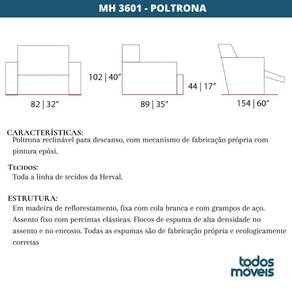 Poltrona Reclinável Mh-3601 Herval Estofada Veludo Cinza C Nada mais prazeroso que poder chegar em casa depois de um dia cansativo e poder descansar em uma linda e confortável poltrona reclinável, não é mesmo? A poltrona reclinável MH-3601 possui uma estrutura em madeira de eucalipto de reflorestamento entregando toda a resistência e durabilidade necessária a um produto como este. Seu estofado revestido em tecido ou couro é super macio para garantir uma sensação mais suave quando em contato com a pele, e de quebra, tem um estilo único, com formato perfeito para abraçar e o seu corpo durante o uso. Sendo a escolha perfeita para você poder descansar e se sentir nas nuvens, depois de um dia cheio. Há outras possibilidades de acabamento para o revestimento. Produto: Poltrona Reclinável MH-3601 Herval Estofada Veludo Cinza C | Garantia (via): 6 | Cor: Cinza | Materiais: Tecido, Espuma, Aço, Madeira | Tonalidade: Cinza | Estilo de Decoração: Vintage | Material da estrutura: Madeira | Linha: MH-3601 | Montagem: Montado | Marca: Herval | Cômodo Indicado: Salas | Tipo de Base: Fixa | Atributos: Versátil, Resistente, Confortável | Área de uso: Interna | Garantia (tempo): 6 meses | Garantia (descritivo): Garantia contra defeitos de fabricação de 06 meses. Consulte as nossas políticas. | Peso (kg): 32.00 | Medidas: Largura (cm): 82.00 | Capacidade de Peso: 120 | Medidas: Profundidade (cm): 89.00 | Medidas: Altura (cm): 99.00 | Medidas: Altura até o Assento (cm): 44.00 | Possui Braços?: Sim | Possui Braços Reguláveis?: Não | Entregue Montado?: Não | Possui Manual de Montagem?: Acompanha o Produto | Origem do Produto: Nacional | Conservação e Manutenção: Limpeza com pano seco, escova com cerdas macias ou aspirador. | Possui Estrutura Giratória?: Não | Possui Estrutura Reclinável?: Sim | Possui Regulagem de Inclinação?: Sim | Tipo de Assento: Reclinável | Tipo de Encosto: Regulável | Tipo de Poltrona: Reclinável | Estado de Origem: RS | Conteúdo da Embalagem: 1 Poltrona | Height: 99 CENTIMETERS | Width: 82 CENTIMETERS | SideToSide: 89 CENTIMETERS