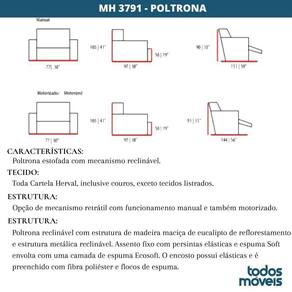 Poltrona Reclinável Mh-3791 Herval Estofada Terracota B Nada mais prazeroso que poder chegar em casa depois de um dia cansativo e poder descansar em uma linda e confortável poltrona reclinável, não é mesmo? A poltrona reclinável MH-3791 possui uma estrutura em madeira de eucalipto de reflorestamento entregando toda a resistência e durabilidade necessária a um produto como este. Seu estofado revestido em tecido ou couro é super macio para garantir uma sensação mais suave quando em contato com a pele, e de quebra, tem um estilo único, com formato perfeito para abraçar e o seu corpo durante o uso. Sendo a escolha perfeita para você poder descansar e se sentir nas nuvens, depois de um dia cheio. Há outras possibilidades de acabamento para o revestimento. Garantia (via): 6 | Cor: Terracota | Produto: Poltrona Reclinável MH-3791 Herval Estofada Terracota B | Materiais: Tecido, Espuma, Aço, Madeira | Estilo de Decoração: Moderno | Tonalidade: Laranja | Material da estrutura: Madeira | Linha: MH-3791 | Marca: Herval | Montagem: Desmontado | Cômodo Indicado: Salas | Tipo de Base: Fixa | Atributos: Versátil, Resistente, Confortável | Área de uso: Interna | Garantia (tempo): 6 meses | Garantia (descritivo): Garantia contra defeitos de fabricação de 06 meses. Consulte as nossas políticas. | Peso (kg): 32.00 | Medidas: Largura (cm): 77.00 | Capacidade de Peso: 120 | Medidas: Profundidade (cm): 97.00 | Medidas: Altura (cm): 90.00 | Medidas: Altura até o Assento (cm): 50.00 | Possui Braços?: Sim | Possui Braços Reguláveis?: Não | Entregue Montado?: Não | Possui Manual de Montagem?: Acompanha o Produto | Origem do Produto: Nacional | Conservação e Manutenção: Limpeza com pano seco, escova com cerdas macias ou aspirador. | Possui Estrutura Giratória?: Não | Possui Estrutura Reclinável?: Sim | Possui Regulagem de Inclinação?: Sim | Tipo de Assento: Reclinável | Tipo de Encosto: Regulável | Tipo de Poltrona: Reclinável | Estado de Origem: RS | Conteúdo da Embalagem: 1 Poltrona | Height: 90 CENTIMETERS | Width: 77 CENTIMETERS | SideToSide: 97 CENTIMETERS