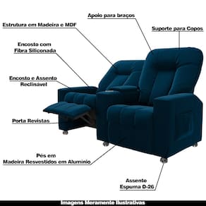 Que tal criar seu próprio home cinema? Aqui, vamos mostrar como você pode montar o seu! Com o local adequado, alguns itens decorativos e uma poltrona ideal, você garantirá um espaço confortável e imersivo. O primeiro passo é investir em equipamentos de alta qualidade! Olha só que lindeza a nossa Poltrona Reclinável Para Cinema 2 Lugares. Ela foi projetada para proporcionar máximo conforto e funcionalidade, esta poltrona é a escolha ideal para quem busca relaxamento, estilo e uma experiência de cinema privada. Seu mecanismo reclinável permite ajustar a poltrona conforme suas necessidades, independente, com 2 estágios e 3 posições ajustáveis, seja para assistir a um filme, ler um livro ou simplesmente descansar. Com capacidade para suportar até 110 kg cada oferecendo segurança e estabilidade ao consumidor. O revestimento em Veludo Azul Marinho oferece um toque de sofisticação e conforto, enquanto a estrutura em madeira de eucalipto garante resistência e durabilidade. O sistema de abertura fácil permite ajustar a poltrona sem esforço: basta colocar as mãos nos braços, inclinar o corpo para trás e empurrar as mãos para frente. O encosto e o assento são sustentados por percintas elásticas. Eles são preenchidos com fibra siliconada e espuma D-26 Soft, respectivamente, para um conforto adicional. Os Encosto e Assento da poltrona é reclinável e nos braços contêm enchimento em espuma D-20, proporcionando um apoio suave e confortável. O assento (fixo) e o apoio de Pés Retrátil proporcionam um apoio perfeito para suas pernas, aumentando o conforto. O encosto reclinável, possibilita ajustá- lo para a posição ideal de relaxamento. Já os pés (fixos) foram feitos em madeira e revestidos em alumínio cromado, adicionando um toque de elegância ao produto. E tem mais!! Ela contém Porta Copo Embutido no Braço e um revisteiro lateral prático nas braças com um bolso prático para armazenar revistas e livros, mantendo tudo ao seu alcance. Com um design moderno e prático, esta poltrona se tornará o destaque da sua sala de estar. Afinal, sua casa merece a Poltrona Reclinável Para Cinema 2 Lugares. Adquira a sua agora mesmo e transforme sua sala de estar em um verdadeiro cinema!