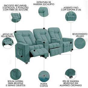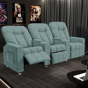 Essa Poltrona Reclinável Para Cinema 3 Lugares Praddo FH9 Veludo Azul Claro, da Mpozenato é a peça projetada para oferecer o máximo conforto e ter seu cinema particular.