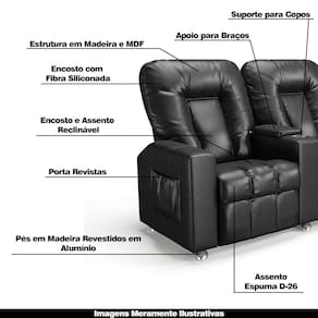 Que tal criar seu próprio home cinema? Aqui, vamos mostrar como você pode montar o seu! Com o local adequado, alguns itens decorativos e uma poltrona ideal, você garantirá um espaço confortável e imersivo. O primeiro passo é investir em equipamentos de alta qualidade! Olha só que lindeza a nossa Poltrona Reclinável Para Cinema 3 Lugares. Ela foi projetada para proporcionar máximo conforto e funcionalidade, esta poltrona é a escolha ideal para quem busca relaxamento, estilo e uma experiência de cinema privada. Seu mecanismo reclinável permite ajustar a poltrona conforme suas necessidades, independente, com 2 estágios e 3 posições ajustáveis, seja para assistir a um filme, ler um livro ou simplesmente descansar. Com capacidade para suportar até 110 kg cada oferecendo segurança e estabilidade ao consumidor. O revestimento em PU Preto oferece um toque de sofisticação e conforto, enquanto a estrutura em madeira de eucalipto garante resistência e durabilidade. O sistema de abertura fácil permite ajustar a poltrona sem esforço: basta colocar as mãos nos braços, inclinar o corpo para trás e empurrar as mãos para frente. O encosto e o assento são sustentados por percintas elásticas. Eles são preenchidos com fibra siliconada e espuma D-26 Soft, respectivamente, para um conforto adicional. Os Encosto e Assento da poltrona é reclinável e nos braços contêm enchimento em espuma D-20, proporcionando um apoio suave e confortável. O assento (fixo) e o apoio de Pés Retrátil proporcionam um apoio perfeito para suas pernas, aumentando o conforto. O encosto reclinável, possibilita ajustá- lo para a posição ideal de relaxamento. Já os pés (fixos) foram feitos em madeira e revestidos em alumínio cromado, adicionando um toque de elegância ao produto. E tem mais!! Ela contém Porta Copos Embutido no Braço e um revisteiro lateral prático nas braças com um bolso prático para armazenar revistas e livros, mantendo tudo ao seu alcance. Com um design moderno e prático, esta poltrona se tornará o destaque da sua sala de estar. Afinal, sua casa merece a Poltrona Reclinável Para Cinema 3 Lugares. Adquira a sua agora mesmo e transforme sua sala de estar em um verdadeiro cinema!