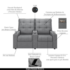 Diferenciais: Apoio de pés retrátil, bolso lateral para revistas e livros, Porta Copos Embutido nos Braços Laterais e Baú porta objetos