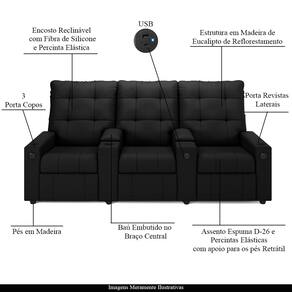 Que tal criar seu próprio home cinema? Aqui, vamos mostrar como você pode montar o seu! Com o local adequado, alguns itens decorativos e uma poltrona ideal, você garantirá um espaço confortável e imersivo. O primeiro passo é investir em equipamentos de alta qualidade! Olha só que lindeza a nossa Poltrona Reclinável Para Cinema Parma 3 Lugares. Ela foi projetada para proporcionar máximo conforto e funcionalidade, esta poltrona é a escolha ideal para quem busca relaxamento, estilo e uma experiência de cinema privada. Seu mecanismo reclinável permite ajustar a poltrona conforme suas necessidades, independente, com 2 estágios e 3 posições ajustáveis, seja para assistir a um filme, ler um livro ou simplesmente descansar. Com capacidade para suportar até 110 kg cada, oferecendo segurança e estabilidade ao consumidor. O revestimento em Veludo Preto oferece um toque de sofisticação e conforto, enquanto a estrutura em madeira de eucalipto garante resistência e durabilidade. O sistema de abertura fácil permite ajustar a poltrona sem esforço: basta colocar as mãos nos braços, inclinar o corpo para trás e empurrar as mãos para frente. O encosto e o assento são sustentados por percintas elásticas. Eles são preenchidos com fibra siliconada e espuma D-26 Soft, respectivamente, para um conforto adicional. Os braços da Poltrona Reclinável contêm enchimento em espuma D-20, proporcionando um apoio suave e confortável. O assento (fixo) e o apoio de Pés Retrátil proporcionam um apoio perfeito para suas pernas, aumentando o conforto. O encosto reclinável, possibilita ajustá- lo para a posição ideal de relaxamento. Já os pés (fixos) foram feitos em madeira, adicionando um toque de elegância ao produto. E tem mais!! Ela contém lém disso, a poltrona ainda conta com porta copos, entrada USB e tipo C,baú porta objetos e um revisteiro lateral prático nas braças com um bolso prático para armazenar revistas e livros, mantendo tudo ao seu alcance. Com um design moderno e prático, esta poltrona se tornará o destaque da sua sala de estar. Afinal, sua casa merece a Poltrona Reclinável Para Cinema Parma 3 Lugares. Adquira a sua agora mesmo e transforme sua sala de estar em um verdadeiro cinema!