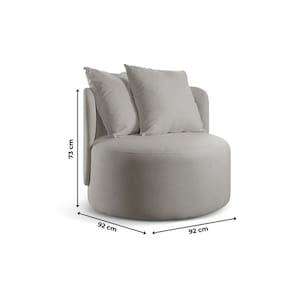 A poltrona Moon combina estilo contemporâneo com design inovador. Suas linhas suaves e estética minimalista trazem sofisticação a qualquer ambiente, enquanto sua forma circular convida ao conforto e acolhimento. Acompanhada de duas almofadas decorativas, adiciona um toque extra de estilo. Sua estrutura em eucalipto tratado garante durabilidade e resistência, enquanto a espuma de alta qualidade, classificada como D28, oferece conforto excepcional. Acompanha Almofadas extras: 02 Acompanha Puff: Não Almofada do assento: Fixa Almofada do encosto: Removível Altura do assento até o chão: 42 cm Altura do Encosto: 31 cm Ambiente Principal: Sala de Estar Cor: Cinza Cor do Produto: Cinza Design Assinado: Não Enchimento do Assento: Espuma D-28 Encosto para a Cabeça: Não Estampado: Não Extensível: Não Firmeza do Assento: Médio Itens Inclusos: 1 poltrona + 2 almofadas Linha ou Coleção: Moon Modelo de Poltrona: Fixo Necessita Montagem: Não Origem do Produto: Nacional Peso: 15 kg Possui Percintas Elásticas: Não Possui Pés: Não Recomendações de Uso, Manutenção e Limpeza: Utilizar aspirador de pó, escova com cerdas macias ou limpeza a seco. Não utilizar produtos químicos, abrasivos ou limpeza a vapor. Evitar exposição prolongada ao sol. Suporta Até (kg): 120 kg Tecido Predominante: Boucle Tipo de Assento: Fixo Tipo de Encosto: Fixo Tipo de Espuma do Assento: Espuma Convencional Tipo de Poltrona: Decorativa Marca: Zurc Decor