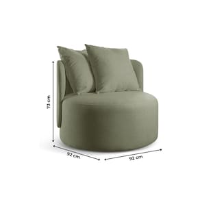 A poltrona Moon combina estilo contemporâneo com design inovador. Suas linhas suaves e estética minimalista trazem sofisticação a qualquer ambiente, enquanto sua forma circular convida ao conforto e acolhimento. Acompanhada de duas almofadas decorativas, adiciona um toque extra de estilo. Sua estrutura em eucalipto tratado garante durabilidade e resistência, enquanto a espuma de alta qualidade, classificada como D28, oferece conforto excepcional. Acompanha Almofadas extras: 02 Acompanha Puff: Não Almofada do assento: Fixa Almofada do encosto: Removível Altura do assento até o chão: 42 cm Altura do Encosto: 31 cm Ambiente Principal: Sala de Estar Cor: Verde Cor do Produto: Verde Design Assinado: Não Enchimento do Assento: Espuma D-28 Encosto para a Cabeça: Não Estampado: Não Extensível: Não Firmeza do Assento: Médio Itens Inclusos: 1 poltrona + 2 almofadas Linha ou Coleção: Moon Modelo de Poltrona: Fixo Necessita Montagem: Não Origem do Produto: Nacional Peso: 15 kg Possui Percintas Elásticas: Não Possui Pés: Não Recomendações de Uso, Manutenção e Limpeza: Utilizar aspirador de pó, escova com cerdas macias ou limpeza a seco. Não utilizar produtos químicos, abrasivos ou limpeza a vapor. Evitar exposição prolongada ao sol. Suporta Até (kg): 120 kg Tecido Predominante: Boucle Tipo de Assento: Fixo Tipo de Encosto: Fixo Tipo de Espuma do Assento: Espuma Convencional Tipo de Poltrona: Decorativa Marca: Zurc Decor