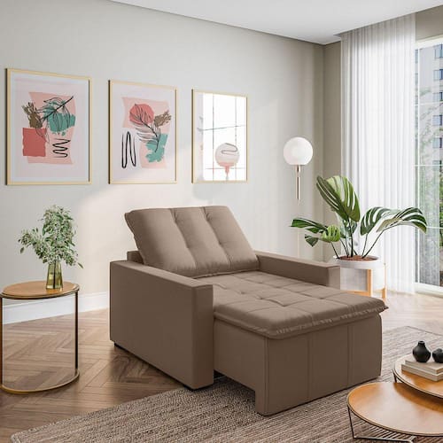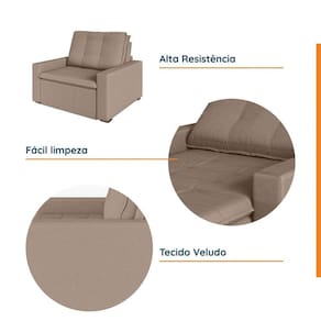 A Poltrona Palmeira CabeCasa MadeiraMadeira é a solução perfeita para quem tem pouco espaço disponível. Com ele você poderá se acomodar com conforto e praticidade. Produzido em madeira maciça de eucalipto, suporta até 200kg. Depois nos conte como foi a experiência de compra e como ficou seu ambiente nos comentários! Acompanha Almofadas extras: Não Acompanha Puff: Não Almofada do assento: Fixa Almofada do encosto: Removível Altura do assento até o chão: 48 cm Altura do Encosto: 60 cm Altura dos Pés: 3 cm Ambiente Principal: Sala de Estar Complexidade da Montagem: Baixa: pode ser montado por uma pessoa sozinha Cor: Castor Cor do Produto: Castor Design Assinado: Não Enchimento do Assento: Espuma D-25 Enchimento do Braço: Espuma D-20 Enchimento do Encosto: Fibra Siliconada Encosto para a Cabeça: Não Estampado: Não Extensível: Sim Firmeza do Assento: Não Possui Itens Inclusos: 1 Poltrona, 4 pés e manual de montagem Linha ou Coleção: Palmeira Manual de Montagem e Instalação: https://product-hub-prd.madeiramadeira.com.br/895100/documents/62adb3d1-23dc-4aed-83d5-faeeb81cc9c9lpoltronapalmeirasempillow.pdf Material do Braço: Madeira de Eucalipto Material dos Pés: Plástico Modelo de Poltrona: Retrátil Necessita Montagem: Sim Peso: 38,64 kg Possui Percintas Elásticas: Sim Possui Pés: 04 Possui Rodízio: Sim Profundidade quando extendido: 144 cm Recomendações de Uso, Manutenção e Limpeza: Evitar exposição direta à luz solar, limpar com escova macia e aspirar o pó semanalmente, não utilizar produtos químicos, removedores, alvejantes, etc. Evite exercer pressão excessiva sobre determinada partes do estofado, não utilizar para limpeza equipamentos a vapor de água. Rodízio com Trava: Não Sistema de Montagem: Pés encaixados. Suporta Até (kg): 200 kg Tecido Predominante: Veludo Tipo de Assento: Fixo Tipo de Encosto: Fixo Tipo de Espuma do Assento: Espuma Convencional Tipo de Poltrona: Leitura