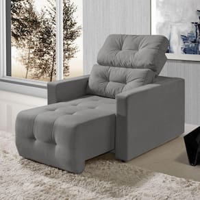 Poltrona Retrátil Reclinável, ótima opção para sua Sala de Estar, Quando aberta fica com a medida de 1,60mts. Estrutura em madeira Eucalipto 100% reflorestamento, Espuma do assento D26, Enchimento do encosto 70% Plumante e 30% Flocos de espumas de diversas densidades. Retrátil com pistão, Encosto com regulagem de 8 estágios (8 posições) , Pés de plástico enjetado, Rodizios de silicone. Assento possui percinta elástica. Acompanha Almofadas extras: Não Acompanha Puff: Não Almofada do assento: Fixa Almofada do encosto: Fixa Altura do assento até o chão: 43 cm Altura do Encosto: 65 cm Altura dos Pés: 3 cm Ambiente Principal: Sala de Estar Cor: Cinza Cor do Produto: Cinza Design Assinado: Não Enchimento do Assento: Espuma D-26 Enchimento do Braço: Espuma D-16 Enchimento do Encosto: Fibra Siliconada Encosto para a Cabeça: Não Estampado: Não Extensível: Sim Firmeza do Assento: Médio Informações Complementares: Poltrona retrátil e reclinável Itens Inclusos: 01 Poltrona Retrátil Reclinável Linha ou Coleção: Linha Material do Braço: Madeira Eucalipto, Espuma D26, Tecido Suede Material dos Pés: Plástico Injetado Modelo de Poltrona: Retrátil Necessita Montagem: Não Origem do Produto: Nacional Peso: 57 kg Possui Percintas Elásticas: Sim Possui Pés: 04 Possui Rodízio: Sim Profundidade quando extendido: 160 cm Recomendações de Uso, Manutenção e Limpeza: Não utilizar produtos quimicos e nem abrasivos, utilizar pano ligeiramente úmido Rodízio com Trava: Sim Suporta Até (kg): 120 kg Tecido Predominante: Suede Tipo de Assento: Regulável Tipo de Encosto: Regulável Tipo de Espuma do Assento: Espuma Convencional Tipo de Espuma do Encosto: Fibra Siliconada Tipo de Poltrona: Do Papai