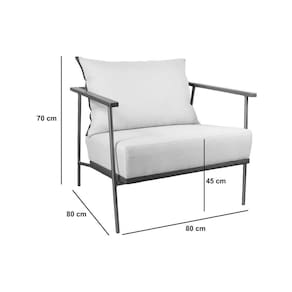Altura 70 cm Profundidade 80 cm Largura 80 cm Quantidade de lugares 1 Peso suportado por assento 150 kg Tecido Linho Material da Estrutura Ferro Assento percintas elásticas, espuma D26 soft (qualidade contínua 6 cm espessura) Tipo do Encosto Almofada solta com fibra siliconada, detalhe traseiro em fivelas Base