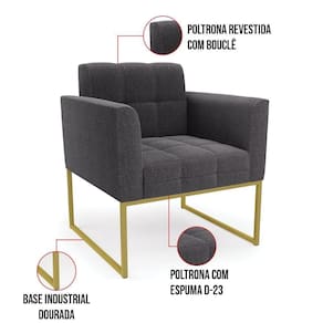 A Poltrona Elisa é uma poltrona que combina elegância, conforto e durabilidade. Ela tem um design retrô e sofisticado, com Base Industrial Dourado e revestimento em tecido Bouclê Grafite, que harmonizam com qualquer ambiente. Ela é ideal para sala de estar, recepções, escritórios, cozinhas ou qualquer outro espaço que você queira decorar com estilo e bom gosto. Ela tem uma estrutura em madeira de reflorestamento eucalipto, que garante a resistência e a sustentabilidade do produto. Ela suporta até 120 kg de peso, podendo ser utilizada por pessoas de diferentes biotipos. Ela tem um acabamento reforçado e espuma de qualidade D23, que oferece maciez e aconchego. Ela contém detalhes de costura no encosto e assento, resultando em um acabamento impecável, conferindo muito mais valor e elegância ao produto. A Poltrona Elisa é um móvel de alta qualidade, beleza e funcionalidade. Ela é fácil de transportar, pois tem um peso leve e um tamanho compacto. A Poltrona Elisa é um produto que vai fazer a diferença na sua decoração e no seu bem-estar. Ela vai trazer charme, conforto e durabilidade para o seu ambiente. Aproveite essa oferta e leve para casa uma poltrona de qualidade por um preço incrível. Essa é a sua chance de ter uma poltrona maravilhosa por um preço imperdível. Corra e garanta a sua antes que acabe o estoque!