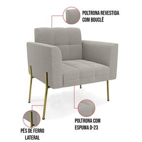 A Poltrona Elisa é uma poltrona que combina elegância, conforto e durabilidade. Ela tem um design retrô e sofisticado, com Pés Laterais de Ferro Dourado e revestimento em tecido Bouclê Cinza, que harmonizam com qualquer ambiente. Ela é ideal para sala de estar, recepções, escritórios, cozinhas ou qualquer outro espaço que você queira decorar com estilo e bom gosto. Ela tem uma estrutura em madeira de reflorestamento eucalipto, que garante a resistência e a sustentabilidade do produto. Ela suporta até 120 kg de peso, podendo ser utilizada por pessoas de diferentes biotipos. Ela tem um acabamento reforçado e espuma de qualidade D23, que oferece maciez e aconchego. Ela contém detalhes de costura no encosto e assento, resultando em um acabamento impecável, conferindo muito mais valor e elegância ao produto. A Poltrona Elisa é um móvel de alta qualidade, beleza e funcionalidade. Ela é fácil de transportar, pois tem um peso leve e um tamanho compacto. A Poltrona Elisa é um produto que vai fazer a diferença na sua decoração e no seu bem-estar. Ela vai trazer charme, conforto e durabilidade para o seu ambiente. Aproveite essa oferta e leve para casa uma poltrona de qualidade por um preço incrível. Essa é a sua chance de ter uma poltrona maravilhosa por um preço imperdível. Corra e garanta a sua antes que acabe o estoque!