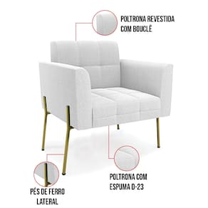 A Poltrona Elisa é uma poltrona que combina elegância, conforto e durabilidade. Ela tem um design retrô e sofisticado, com Pés Laterais de Ferro Dourado e revestimento em tecido Bouclê. Ela é ideal para sala de estar, recepções, escritórios, cozinhas ou qualquer outro espaço que você queira decorar com estilo e bom gosto. Ela tem uma estrutura em madeira de reflorestamento eucalipto, que garante a resistência e a sustentabilidade do produto. Ela suporta até 120 kg de peso, podendo ser utilizada por pessoas de diferentes biotipos. Ela tem um acabamento reforçado e espuma de qualidade D23, que oferece maciez e aconchego. Ela contém detalhes de costura no encosto e assento, resultando em um acabamento impecável, conferindo muito mais valor e elegância ao produto. A Poltrona Elisa é um móvel de alta qualidade, beleza e funcionalidade. Ela é fácil de transportar, pois tem um peso leve e um tamanho compacto. A Poltrona Elisa é um produto que vai fazer a diferença na sua decoração e no seu bem-estar. Ela vai trazer charme, conforto e durabilidade para o seu ambiente. Aproveite essa oferta e leve para casa uma poltrona de qualidade por um preço incrível. Essa é a sua chance de ter uma poltrona maravilhosa por um preço imperdível. Corra e garanta a sua antes que acabe o estoque!