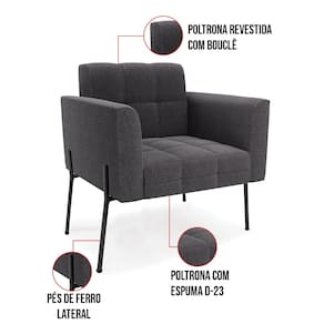 A Poltrona Elisa é uma poltrona que combina elegância, conforto e durabilidade. Ela tem um design retrô e sofisticado, com Pés Laterais de Ferro Preto e revestimento em tecido Bouclê Grafite, que harmonizam com qualquer ambiente. Ela é ideal para sala de estar, recepções, escritórios, cozinhas ou qualquer outro espaço que você queira decorar com estilo e bom gosto. Ela tem uma estrutura em madeira de reflorestamento eucalipto, que garante a resistência e a sustentabilidade do produto. Ela suporta até 120 kg de peso, podendo ser utilizada por pessoas de diferentes biotipos. Ela tem um acabamento reforçado e espuma de qualidade D23, que oferece maciez e aconchego. Ela contém detalhes de costura no encosto e assento, resultando em um acabamento impecável, conferindo muito mais valor e elegância ao produto. A Poltrona Elisa é um móvel de alta qualidade, beleza e funcionalidade. Ela é fácil de transportar, pois tem um peso leve e um tamanho compacto. A Poltrona Elisa é um produto que vai fazer a diferença na sua decoração e no seu bem-estar. Ela vai trazer charme, conforto e durabilidade para o seu ambiente. Aproveite essa oferta e leve para casa uma poltrona de qualidade por um preço incrível. Essa é a sua chance de ter uma poltrona maravilhosa por um preço imperdível. Corra e garanta a sua antes que acabe o estoque!