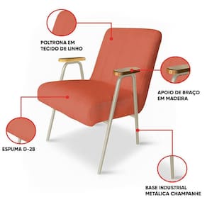 Poltrona Sala Decorativa Industrial Champanhe Laurita Linho Salmão K01 - D'rossi Adicione um toque de distinção ao seu décor com a Poltrona Laurita Salmão, uma peça que harmoniza bem-estar e estética em um design moderno e sofisticado. Sua base em metal na cor champanhe acrescenta um toque industrial elegante. O revestimento é constituído por tecido de linho, oferecendo uma textura agradável ao toque e uma aparência elegante, valorizando qualquer ambiente. O assento é preenchido com espuma D-28 de alta densidade, o que garante firmeza superior e excelente durabilidade para o cotidiano. O grande destaque está nos braços vasados em estrutura metálica, que além de reforçarem a estética moderna, criam um efeito leve e elegante. O apoio em madeira maciça traz contraste natural e completa o charme da peça. Essa combinação de materiais resulta em uma poltrona de grande apelo visual, perfeitamente versátil para ser utilizada em salas, escritórios ou espaços de leitura, elevando o conforto e a elegância do seu lar. Dimensões do Produto: