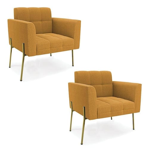 A Poltrona Elisa é uma poltrona que combina elegância, conforto e durabilidade. Ela tem um design retrô e sofisticado, com Pés Laterais de Ferro Dourado e revestimento em tecido Bouclê Mostarda, que harmonizam com qualquer ambiente. Ela é ideal para sala de estar, recepções, escritórios, cozinhas ou qualquer outro espaço que você queira decorar com estilo e bom gosto. Ela tem uma estrutura em madeira de reflorestamento eucalipto, que garante a resistência e a sustentabilidade do produto. Ela suporta até 120 kg de peso, podendo ser utilizada por pessoas de diferentes biotipos. Ela tem um acabamento reforçado e espuma de qualidade D23, que oferece maciez e aconchego. Ela contém detalhes de costura no encosto e assento, resultando em um acabamento impecável, conferindo muito mais valor e elegância ao produto. A Poltrona Elisa é um móvel de alta qualidade, beleza e funcionalidade. Ela é fácil de transportar, pois tem um peso leve e um tamanho compacto. A Poltrona Elisa é um produto que vai fazer a diferença na sua decoração e no seu bem-estar. Ela vai trazer charme, conforto e durabilidade para o seu ambiente. Aproveite essa oferta e leve para casa uma poltrona de qualidade por um preço incrível. Essa é a sua chance de ter uma poltrona maravilhosa por um preço imperdível. Corra e garanta seu Kit 2 Poltronas antes que acabe o estoque!