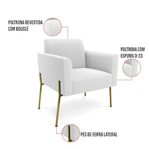 A Poltrona Marisa é a escolha perfeita para quem deseja unir conforto e comodidade em um estilo elegante. Com um design único, ela possui Pés de Ferro Lateral Dourado que harmoniza com o seu belíssimo tom Off White, criando uma combinação elegante de conforto e estilo. Ela é perfeita para quem busca móveis que não só sejam bonitos, mas que também proporcionem bem-estar. Ideal para compor salas de estar, recepções, bibliotecas, salas de leitura, espaços de design e até áreas comerciais, essa peça versátil é pensada para ambientes que excluam beleza e aconchego. Sua estrutura, em madeira de reflorestamento de eucalipto, oferece resistência e sustentabilidade, suportando até 120 kg, garantindo segurança para usuários de diferentes biotipos. O conforto é outro destaque, com estofado em espuma prorelax D-23, que proporciona suporte e maciez ideais. Revestida em Bouclê, um tecido maleável e sofisticado, a Poltrona Marisa segue a tendência do momento com um toque suave e quente, remetendo à textura natural da lã. Leve e fácil de transportar, a Poltrona Marisa é um item que agrega charme e durabilidade ao seu espaço. Não perca a oportunidade de adquirir essa peça exclusiva que fará toda a diferença na sua decoração e no seu bem-estar. Aproveite agora!
