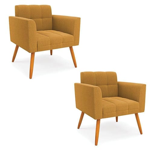 A Poltrona Elisa é uma poltrona que combina elegância, conforto e durabilidade. Ela tem um design retrô e sofisticado, com Pés Palito Castanho e revestimento em tecido Bouclê Mostarda, que harmonizam com qualquer ambiente. Ela é ideal para sala de estar, recepções, escritórios, cozinhas ou qualquer outro espaço que você queira decorar com estilo e bom gosto. Ela tem uma estrutura em madeira de reflorestamento eucalipto, que garante a resistência e a sustentabilidade do produto. Ela suporta até 120 kg de peso, podendo ser utilizada por pessoas de diferentes biotipos. Ela tem um acabamento reforçado e espuma de qualidade D23, que oferece maciez e aconchego. Ela contém detalhes de costura no encosto e assento, resultando em um acabamento impecável, conferindo muito mais valor e elegância ao produto. A Poltrona Elisa é um móvel de alta qualidade, beleza e funcionalidade. Ela é fácil de transportar, pois tem um peso leve e um tamanho compacto. A Poltrona Elisa é um produto que vai fazer a diferença na sua decoração e no seu bem-estar. Ela vai trazer charme, conforto e durabilidade para o seu ambiente. Aproveite essa oferta e leve para casa uma poltrona de qualidade por um preço incrível. Essa é a sua chance de ter uma poltrona maravilhosa por um preço imperdível. Corra e garanta seu Kit 2 Poltronas antes que acabe o estoque!