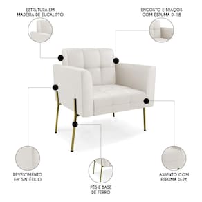 A Poltrona Para Sala é revestida em Sintético, que é durável e fácil de limpar, e ainda valoriza o design da poltrona. Os braços e encosto são confortáveis em espuma D-18, já o assento é com espuma D-26 de alta densidade, que garante um assento firme e aconchegante, ideal para relaxar após um dia cansativo. Os Pés de Ferro, não só garantem estabilidade e longevidade, mas também adicionam um toque de luxo ao design geral. São 2 poltronas com estrutura resistente que suporta até 120 kg cada. A montagem é muito simples, pois a poltrona já vem pronta, bastando apenas fixar a base com os parafusos que acompanham o produto. A limpeza também é muito prática, pois basta utilizar um pano limpo e levemente úmido, sem produtos abrasivos, para manter a sua poltrona sempre em bom estado. Sem dúvidas a Poltrona Para Sala vai transformar seu ambiente, deixando mais confortável e estiloso!