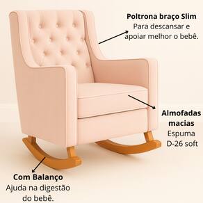 O estofamento em Tecido Saturno proporciona uma suavidade incomparável, enquanto as almofadas com espuma D-26 oferecem um suporte ergonômico que alivia a pressão na coluna. Essa poltrona é ideal para amamentação, com um formato que assegura o bem-estar tanto da mãe quanto do bebê.