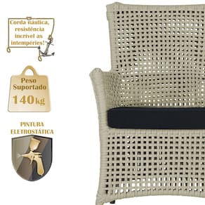A corda náutica adiciona um toque de rusticidade moderna, enquanto o estofado impermeável garante que sua poltrona esteja sempre impecável, mesmo após uma chuva inesperada ou um acidente com líquidos.