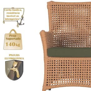 A corda náutica adiciona um toque de rusticidade moderna, enquanto o estofado impermeável garante que sua poltrona esteja sempre impecável, mesmo após uma chuva inesperada ou um acidente com líquidos.