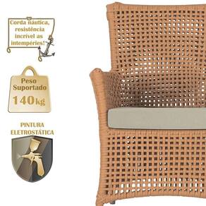 A corda nautica adiciona um toque de rusticidade moderna, enquanto o estofado impermeavel garante que sua poltrona esteja sempre impecavel, mesmo apos uma chuva inesperada ou um acidente com liquidos.