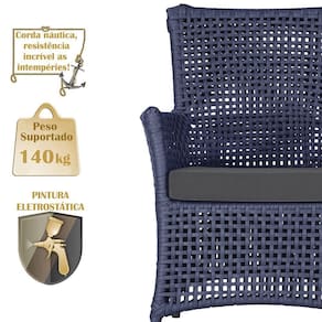A corda nautica adiciona um toque de rusticidade moderna, enquanto o estofado impermeavel garante que sua poltrona esteja sempre impecavel, mesmo apos uma chuva inesperada ou um acidente com liquidos.