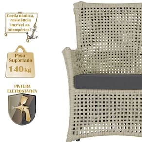 A corda nautica adiciona um toque de rusticidade moderna, enquanto o estofado impermeavel garante que sua poltrona esteja sempre impecavel, mesmo apos uma chuva inesperada ou um acidente com liquidos.