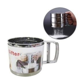 Polvilhador Inox Luxo Peneirar Caneca Farinha Com Gatilho Polvilhador / Peneirador de Farinha Excelente durabilidade é um ótimo auxílio para sua confeitaria. Esta Caneca Polvilhadora é um utensílio prático para peneirar farinha, açúcar ou outros ingredientes secos. A tela em inox com 1 mm de medida peneira extremamente bem. Possui um mexedor para facilitar o seu trabalho. Apertando o gatilho na alça irá movimentar e peneirar o ingrediente.