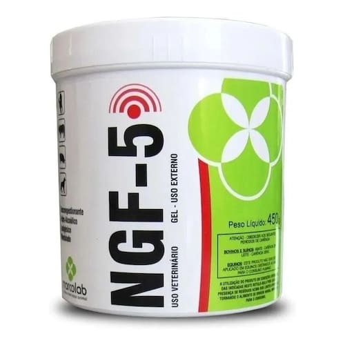 NGF-5 é indicado no tratamento das luxações, traumas ou dores musculares, nas contusões, nos edemas, artrites e nos nódulos localizados.Recomendado nas distensões musculares podendo ser também como relaxante muscular após exercícios fortes e para atenuar o .Pode ser como aquecimento dos músculos, antes dos exercícios.Modo de usarNGF-5 pode ser aplicado puro ou previamente diluído em água. PURO- massagear o produto diretamente no local da lesão. Diluído - em um litro de água morna, diluir duas colheres de sopa de NGF-5 e aplicar sobre o local traumatizado.Repetir se necessário uma a duas aplicações diárias. NGF-5 não é irritante, nem cáustico, nem gorduroso, mesmo nas peles mais sensíveis.Nos casos de hipersensibilidade, suspender o uso do produto e consultar o Médico Veterinário.Benefíciosfácil de usarNão queima ou irrita a peleEstimula a circulação do sangueAtua profundamente dentro dos tecidosRelaxa, elimina o e restaura os músculos fatigados, tendões e ligamentos afetadosNão deixa resíduos, nem engordura Sugestão Pode ser em conjunto com o Ice Sport proporcionando uma crio-massagem. Precaução manter a embalagem fechada, em local seco e fresco ao abrigo da luz solar e fora do alcance de crianças. Apresentação de venda e envio Bisnaga contendo 450g. informações Adicionais - Não nos responsabilizamos pelo uso incorreto ou aplicação inadequada. - Proibida ingestão. - Procure sempre um Médico Veterinário