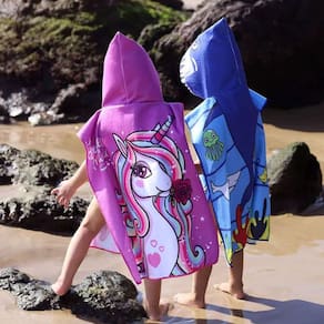 Saída de banho poncho infantil com capuz e saco de lavanderia. Estampas coloridas e alegres que veste a criança de cuidados e conforto. O roupão infantil deixa as crianças mais protegidas contra vento, sol e areia. Ideal para levar à praia ou piscina.