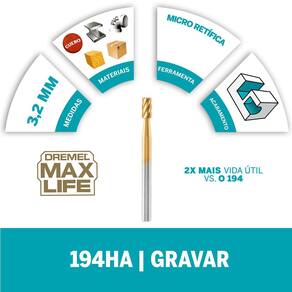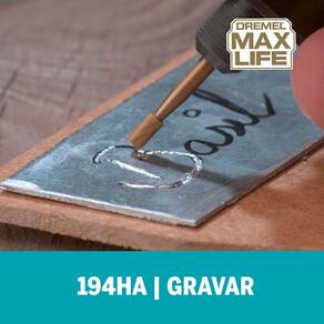 - A linha de acessórios Dremel® MaxLife – projetada por nossos engenheiros – oferece máxima durabilidade e desempenho a longo prazo. A ponta de gravar Dremel MaxLife 194HP para trabalhos exigentes é revestida com nitreto de titânio, por isso dura o dobro do tempo do acessório padrão não revestido.