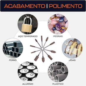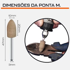 Ponta Montada 10mm Cônica de Couro Haste 3mm para Polimento com Micro Retíficas Dremax - Marca: Dremax - Referência: PM036 - Material: Couro de Vaca - Indicado para acabamento e polimento - Diâmetro da haste: 3mm - Diâmetro da ponta: 10mm - Altura da ponta: 20mm - Comprimento total: 47mm - Gramatura: Grão 180 - Formato: Cônica Ponta de Bala - As pontas montadas rosa são indicadas para uso geral - Uso em micro retíficas de qualquer marca com mandril de 3mm - Indicada para afiação, esmerilhamento e desbaste em metais, joias, pedras preciosas, vidro, entre outros materiais - Seu formato facilita o trabalho em locais de difícil acesso - : 90 dias contra defeitos de fabricação A DREMAX é a primeira e única marca brasileira dedicada exclusivamente às micro retíficas, acessórios e acoplamentos para esta indispensável ferramenta. Seja para trabalhos de precisão, artesanato, modelagem ou reparos, a DREMAX tem o produto certo para você - Ponta Montada Amarela: Alta dureza para polimento fino. Grão 240 - Ponta montada Azul: :Alta dureza para acabamento médio. Grão 150 - Ponta Montadas Rosa: Alta dureza e tenacidade acabamento grosso Grão. 120 - Ponta Montada Borracha Verde: Flexível, para retificação e polimento precisos. Grão 150 - Ponta Montada de Couro: Desempenho melhor do que a ponta de borracha verde, também ideal para polimento. Grão 180 - Ponta Montada Borracha com Abrasivos: Retificação mais nítida e rápida. Grão 120 - Ponta montada de Feltro: Polimento fino em metais e materiais não metálicos Marca: Não Informado Ean: 7734625990882